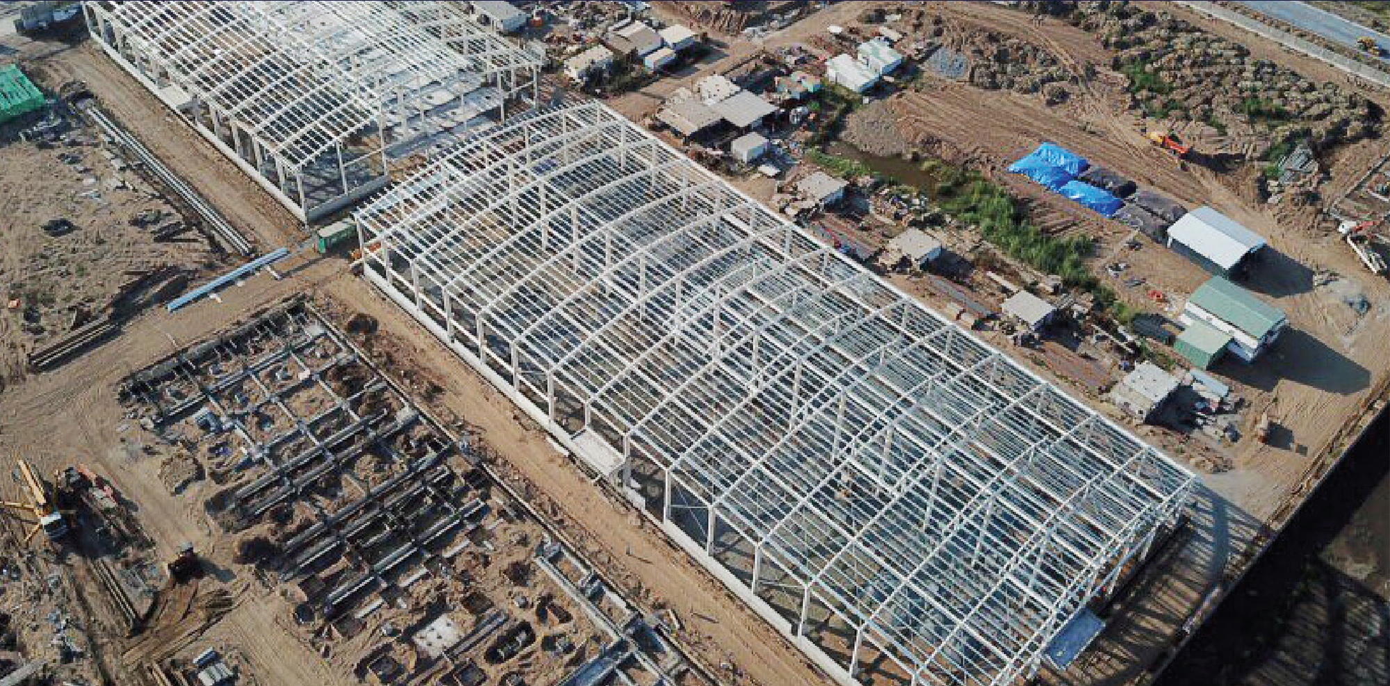 清远百和钢结构厂房工程建筑面积 18,000 平方米,500 吨钢材用于工程,屋面、墙面彩钢瓦采用白色并且使用红色彩钢瓦做装饰线条,配色造型时尚美观。
